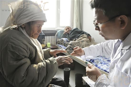 2011年1月4日,乌鲁木齐市救助站的工作人员在为被救助人员涂抹冻疮膏。连日来,乌鲁木齐市民政、行政执法、卫生、公安等部门组成工作队,上街对生活无着落人员进行救助,市救助站准备了100多套棉衣棉裤棉鞋和300多个床位帮助他们度过严寒。