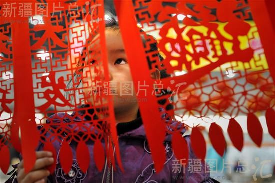 2011年1月15日,小朋友在新疆国际博览中心挑选剪纸春联。该中心正在举办为期20天的第四届新疆新春年货博览会。兔年春节将至,市民纷纷涌进年货博览会置办年货、听大戏,乌鲁木齐年味渐浓。