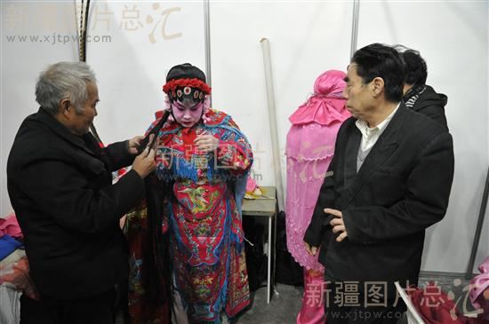 2011年1月15日,演员在新疆国际博览中心化妆。该中心正在举办为期20天的第四届新疆新春年货博览会。兔年春节将至,市民纷纷涌进年货博览会置办年货、听大戏,乌鲁木齐年味渐浓。
