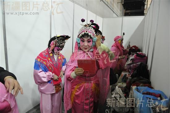 2011年1月15日,演员在新疆国际博览中心化妆。该中心正在举办为期20天的第四届新疆新春年货博览会。兔年春节将至,市民纷纷涌进年货博览会置办年货、听大戏,乌鲁木齐年味渐浓。