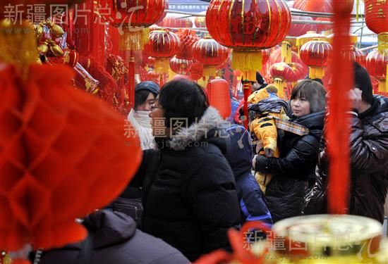 2011年1月30日,市民在乌鲁木齐市华凌市场购买年货。春节临近,乌市各族市民选购鲜花、红灯笼、中国结等扮靓居室,迎接新年。