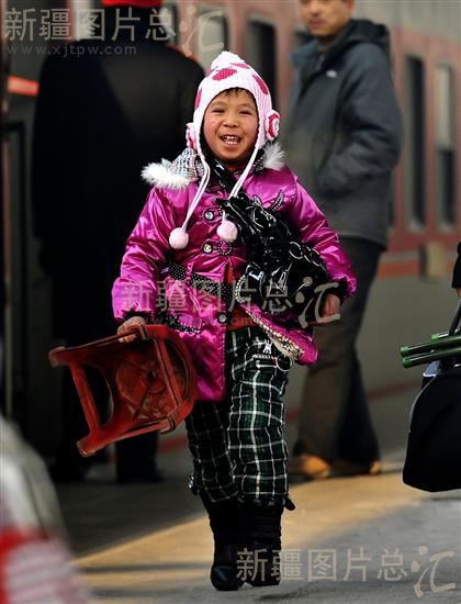 2011年1月10日,一名小旅客在乌鲁木齐铁路局乌鲁木齐站准备登上列车。