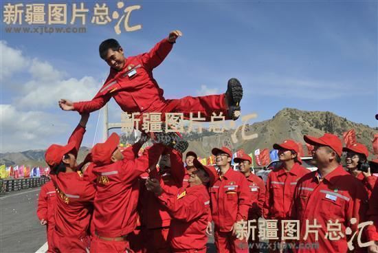 2011年9月30日,果子沟大桥通车。建设者们在欢庆这一时刻。