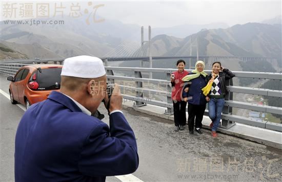 2011年9月29日,果子沟大桥通车前一日。游客在大桥上合影留念。