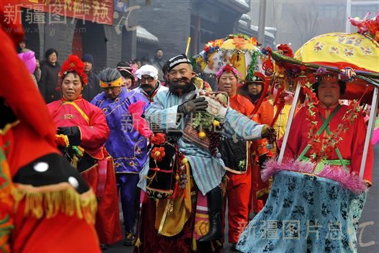 2011年2月3日,乌鲁木齐市天山区阳光社火艺术团的团员在乌鲁木齐市文庙门前闹社火。