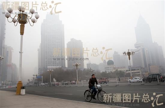 2010年11月24日,一名市民在雾霾天气里骑行在乌市西大桥上。