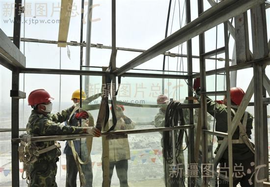 2011年5月3日,工人在新疆国际会展中心施工现场安装玻璃幕墙。该工程已进入倒计时冲刺阶段,预计本月底一期工程完工,7月份完成设备调试达到正式使用条件。作为我区50年来最大的房屋建筑、自治区地标工程,新疆国际会展中心占地面积35万平方米,一期工程总建筑面积约11.2万平方米,总投资11.92亿元。会展中心建成后,可满足8000个展位、同时容纳4000人参会,将成为西部地区面向中亚规模最大、功能最全的国际会展中心。