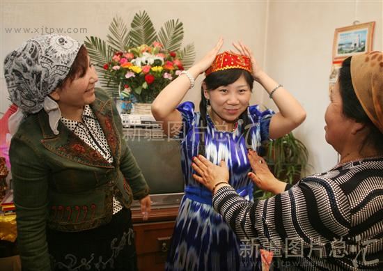 2008年5月7日,毛兰的母亲阿尔孜古丽(左)给王燕娜穿上艾得莱斯连衣裙、戴上维吾尔小花帽,认她为自己的女儿。与毛兰母亲一起来的还有泽普县县长玉买尔江以及毛兰的姑妈和舅舅。