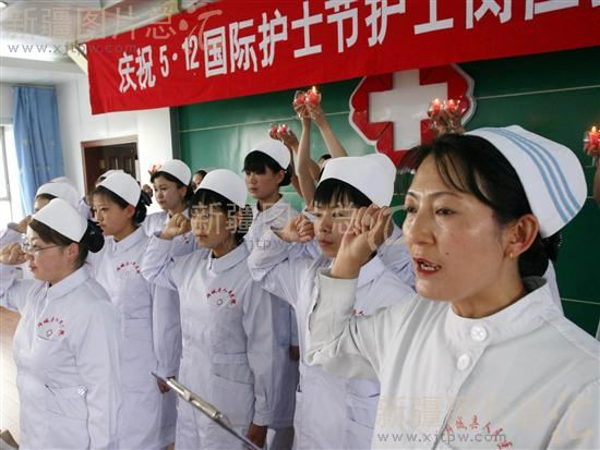 2008年5月12日,新疆阿克苏地区拜城县人民医院的护士在护士授帽仪式上宣誓。当天,该院举行“5·12”国际护士节纪念活动。医务工作者通过岗位技能竞赛等活动庆祝自己的节日。