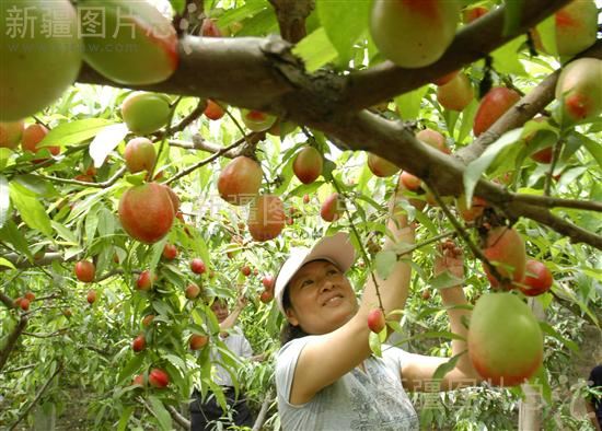 2008年5月11日,游客在无公害水果生产基地里采摘水果。新疆阿克苏市大力发展无公害蔬菜水果的同时,将种植与旅游结合起来,把水果基地向游客开放,供人们休闲渡假。
