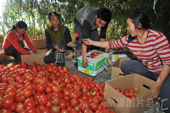 2012年11月12日,察布查尔锡伯自治县纳达齐乡农民陈树林(中)一家在包装反季节蔬菜西红柿。据了解,察县现有温室大棚4948座,各类拱棚3214座,全县上半年生产各类蔬菜3万多吨,出口蔬菜5210吨,实现收入1亿多元。