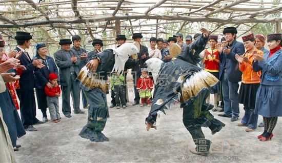 2008年4月23日,新疆阿克陶县城郊外新建的居民点里过上新生活的塔吉克族牧民在自己的新居前跳起了具有浓郁民族风情的鹰舞。 这里的牧民原来居住在距县城400多公里的帕米尔高原上。1999年,一场泥石流毁灭了他们的家园。灾情发生后,党和政府对受灾的塔吉克族牧民实施了扶贫搬迁,在离县城不远的地方为他们建了新家园,并成立了塔尔塔吉克民族乡。