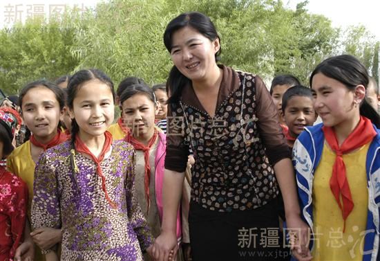 2008年5月16日,宋柏艳和学生们在一起。1992年,22岁的哈尔滨姑娘宋柏艳,千里迢迢来到于田县兰干乡阿热村落户。10多年来,宋柏艳克服语言障碍和生活习惯等困难,为边远农村的双语教学工作倾注了自己的青春和热血,赢得群众的好评,多次被评为和田地区和于田县民族团结先进个人。