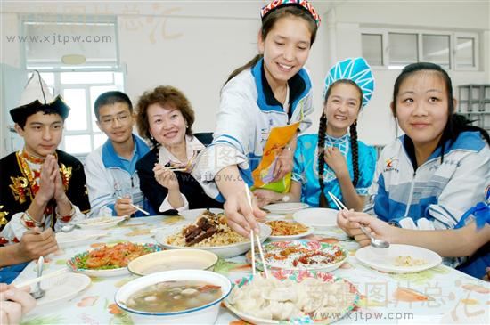 2008年5月5日,在乌鲁木齐市第三中学劳动技术课上,学生们在分享自己动手做的美食。该校在劳动技术课上开办了缝纫、盆栽、电工等技能培训,深受学生喜爱。