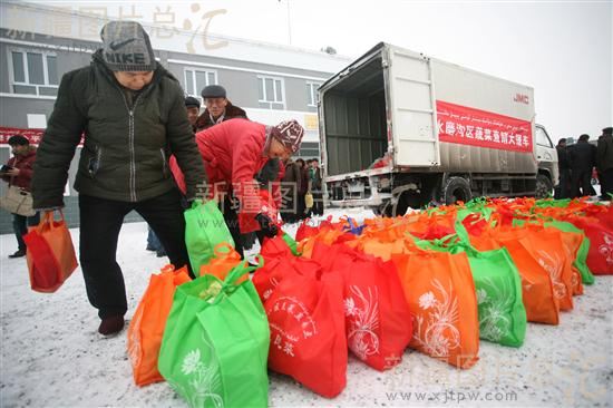 2011年12月31日,乌鲁木齐市水磨沟区石人子沟村村民排长队领取新鲜蔬菜。据悉,为缓解农牧区群众“买菜难 买菜贵”的问题,该区推出了“蔬菜直销大篷车”的新销售模式,当日共有500公斤的白菜、土豆、胡萝卜等被大篷车运到村里。蔬菜全部免费发放给弱势群体。相关负责人表示,今后还将定期向该区边远村镇开出“蔬菜直销大篷车”,销售农民生活必须的25种蔬菜。
