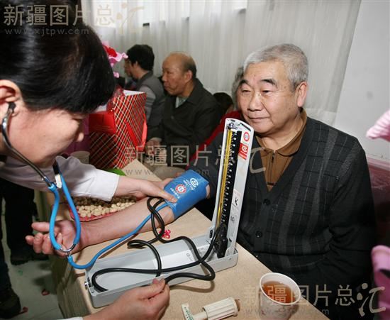 2012年2月13日,熊新普老人在接受医务工作者测量血压。