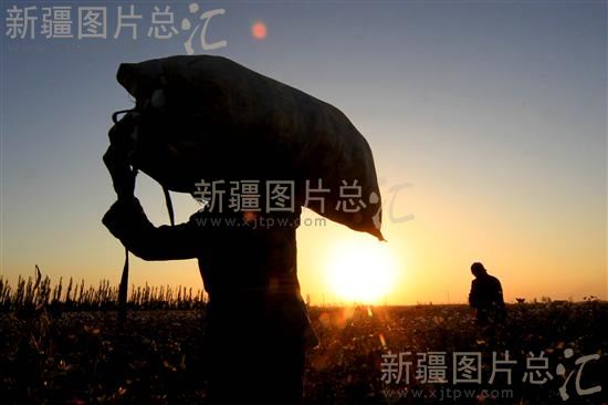 2013年10月26日,新疆哈密市现代农业园区采棉工扛着刚采摘的新棉走出棉田。