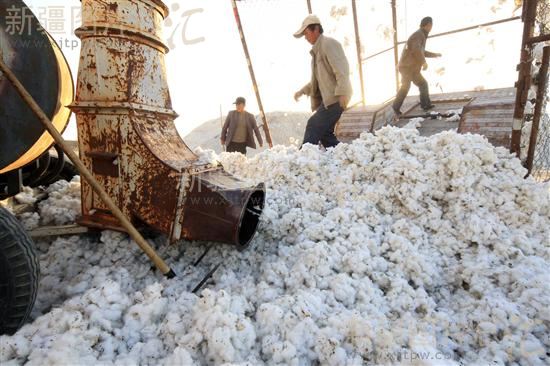 2013年10月26日,棉农在新疆哈密西戈壁棉花收购点上交售的新棉。