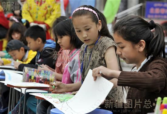 2011年5月21日,小朋友在现场作画。当日,乌鲁木齐市新华南路街道北国春城社区,举办以“民族团结”为主题的少儿书画比赛,用寓教于乐的形式让孩子们从小树立“民族团结”的意识。