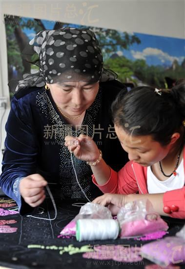 2011年5月9日,木垒哈萨克自治县大南沟乌孜别克族乡定居点牧民古丽娜尔(左)在给学徒传授刺绣技艺。定居后古丽娜尔办起了刺绣合作社加工旅游工艺品,产品已销往哈萨克斯坦、蒙古等国。