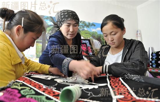 2011年5月9日,木垒哈萨克自治县大南沟乌孜别克族乡定居点牧民古丽娜尔(中)在给学徒传授刺绣技艺。定居后古丽娜尔办起了刺绣合作社加工旅游工艺品,产品已销往哈萨克斯坦、蒙古等国。