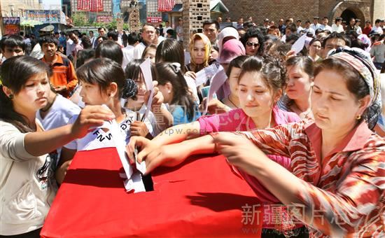 5月19日,新疆国际大巴扎各族员工、商户在大巴扎广场为四川地震灾区捐款。