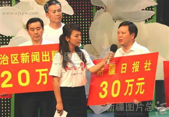 5月23日晚,在赈灾义演现场,新疆日报社等新闻宣传单位为汶川灾区捐款。