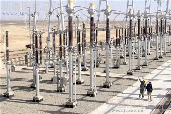 工作人员在新疆哈密烟墩西风电汇集站巡查(2013年10月25日摄)。
