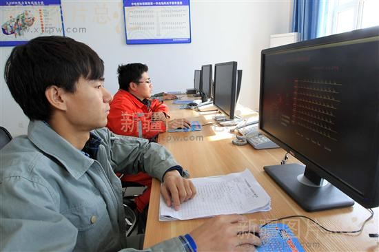 工作人员在已建成的中电新疆投哈密烟墩20万千瓦风力发电场总控室监控设备运行情况(2013年10月25日摄)。