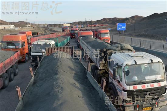 2013年10月29日,新疆老爷庙口岸,满载矿砂等待入关的车辆。