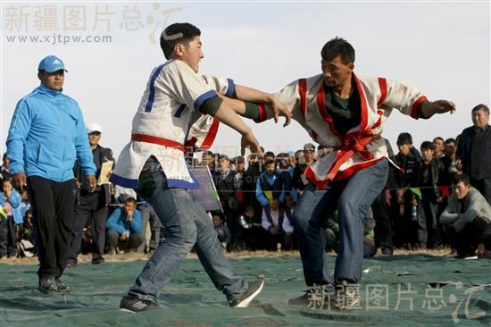 2013年10月19日,在阿勒泰地区福海县齐干吉迭乡,当地牧民在进行摔跤比赛。