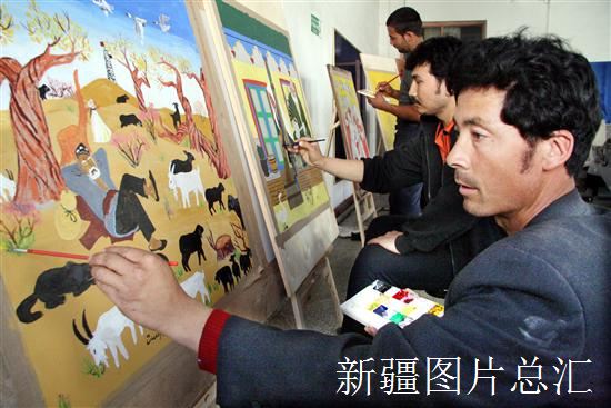 2008年4月10日,库车县墩阔坦镇53岁的农民苏黎唐(右)等10余位农民在现场作画。为弘扬库车县优秀传统文化,展示新时期农民的精神风貌,该县文体局举办了首届农民画展。