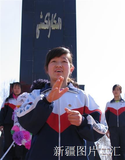 2008年4月1日,特殊教育学校的学生舍文梅在革命烈士纪念碑前用手语表达对革命先辈的哀思以及立志自强的决心。当天,塔城地区特殊教育学校的聋哑儿童在老师的带领下,来到塔城革命烈士陵园为革命先辈扫墓并种下小树来寄托对革命先辈们的哀思。