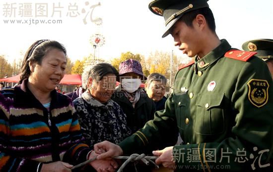 2013年11月2日,消防战士在给社区居民教授逃生绳的正确系法。