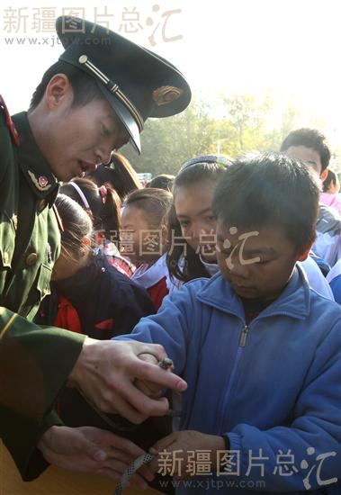 2013年11月2日,消防战士在为小学生传授逃生绳的正确系法。