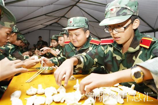 8月14日,乌鲁木齐市西林社区和三十五户路社区的孩子,在一军事夏令营里学习包饺子。