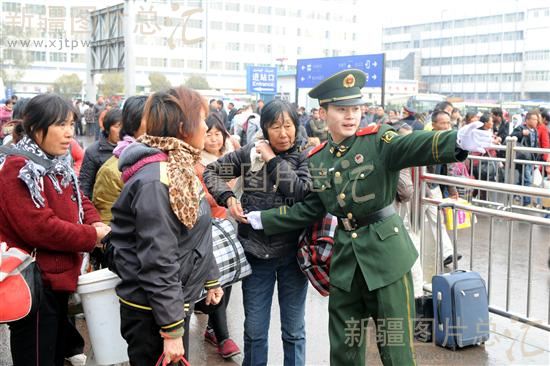 当日,武警新疆边防总队勤务保障大队派出15名战士组成便民服务队,负责维持进站秩序、引导候车、为老弱病残旅客提供服务。