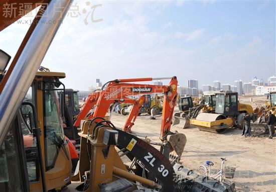 位于新疆生产建设兵团第五师86团5连的一处停满了铲车、吊车等机械车辆的机械车租赁市场(2013年11月4日摄)。近年来,86团依托城郊优势和毗邻工业团区、物流园区的地缘优势,团场职工职工纷纷以贷款、入股等形式购买大型工程机械、车辆,加入到机械车租赁行业。