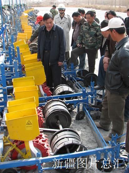 2008年3月25日,29团农机工作人员对全团即将进行春播的农机具进行检查验收。今年该团8万亩棉花实施精量播种,职工及早平整土地,农资、节水滴灌带等全部备齐,72辆播种机已检修完毕,只待春播。