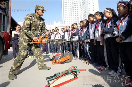 2013年11月5日,消防教官在新疆哈密市第六中学为师生展示消防设备。