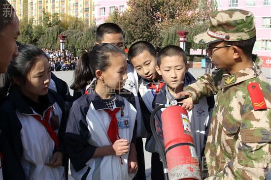 2013年11月5日,消防战士在新疆哈密市第六中学为师生讲解灭火器的使用方法。