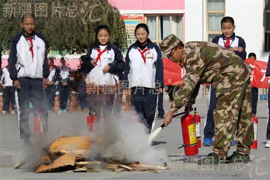 2013年11月5日,消防战士在新疆哈密市第六中学为师生示范灭火器的使用方法。