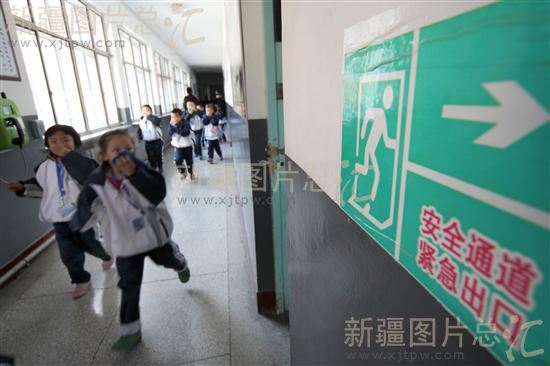 2013年11月5日,新疆哈密市第六中学小学部的孩子们在开展疏散演练。