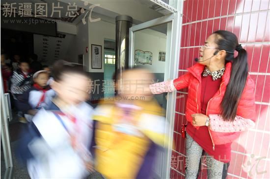2013年11月5日,新疆哈密市第六中学小学部的孩子们在老师的引导下紧急撤离。