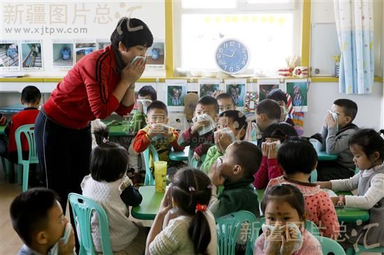 2013年11月6日,在乌鲁木齐市昱萌园林幼儿园,老师在给小朋友讲授火灾逃生方法。