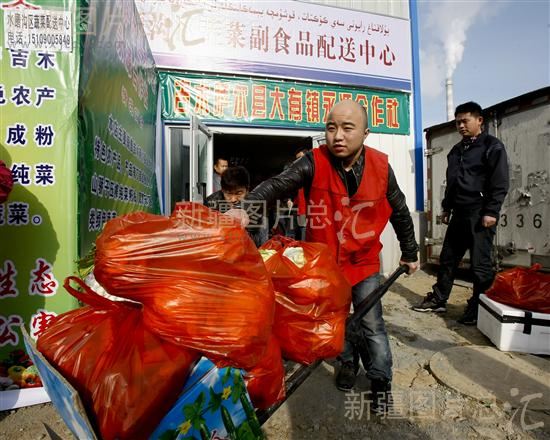 2013年11月7日,在乌鲁木齐市水磨沟区蔬菜副食品配送中心门前,工作人员为辖区内的各蔬菜副食品直销点配送蔬菜。