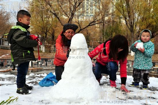 2013年11月9日,新疆克拉玛依市迎来入冬首场降雪,市民纷纷走出户外,体验冰雪乐趣。
