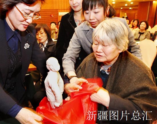 2008年4月3日,刘胡兰的入党介绍人吕铭(右)将刘胡兰烈士汉白玉雕像捐赠给中国妇女儿童博物馆。