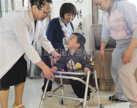 2011年5月11日,工作人员为残疾儿童赠送助行架。