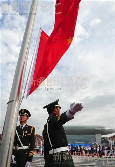 2011年8月17日,武警战士在新疆国际会展中心广场上升国旗。